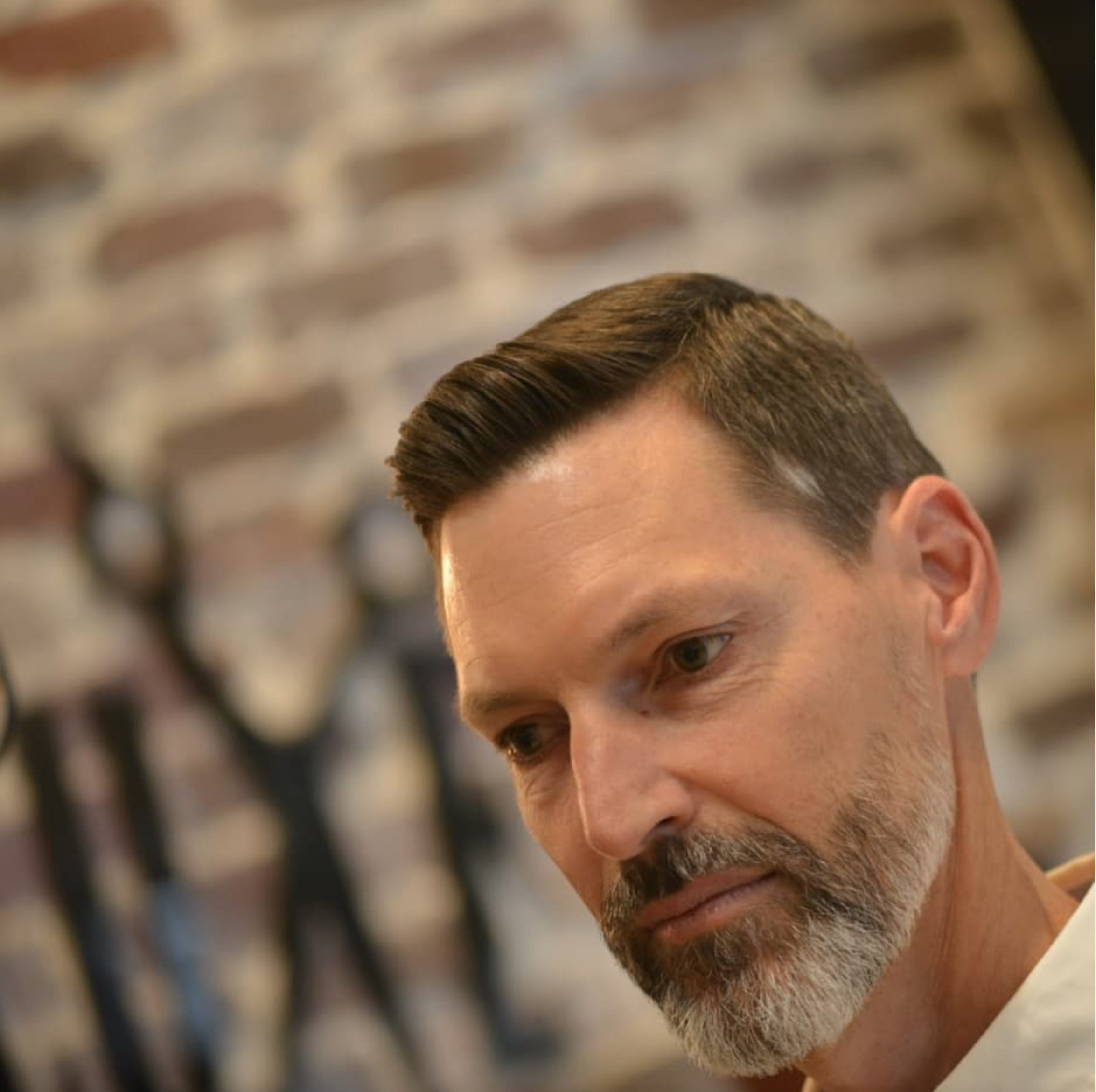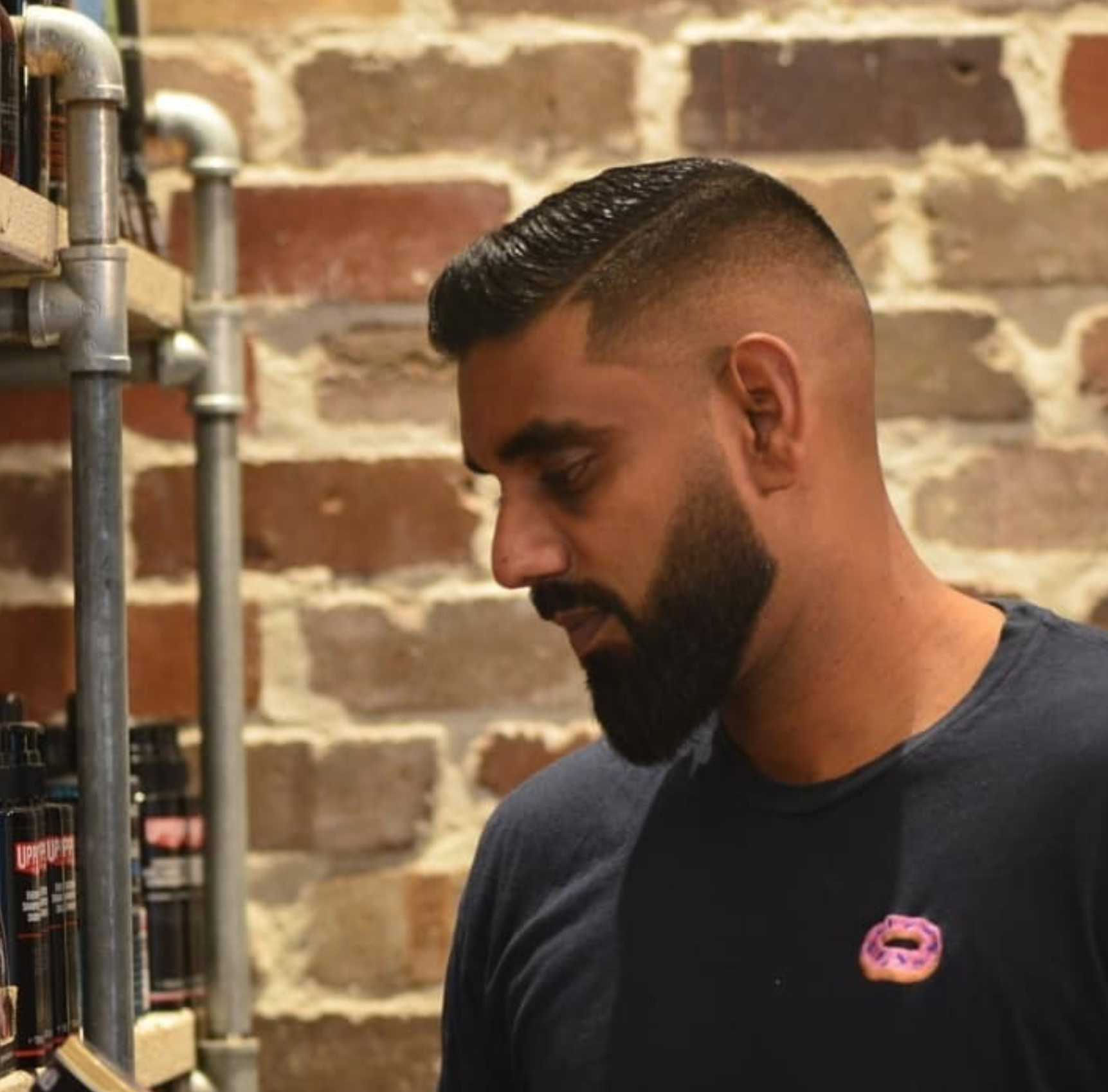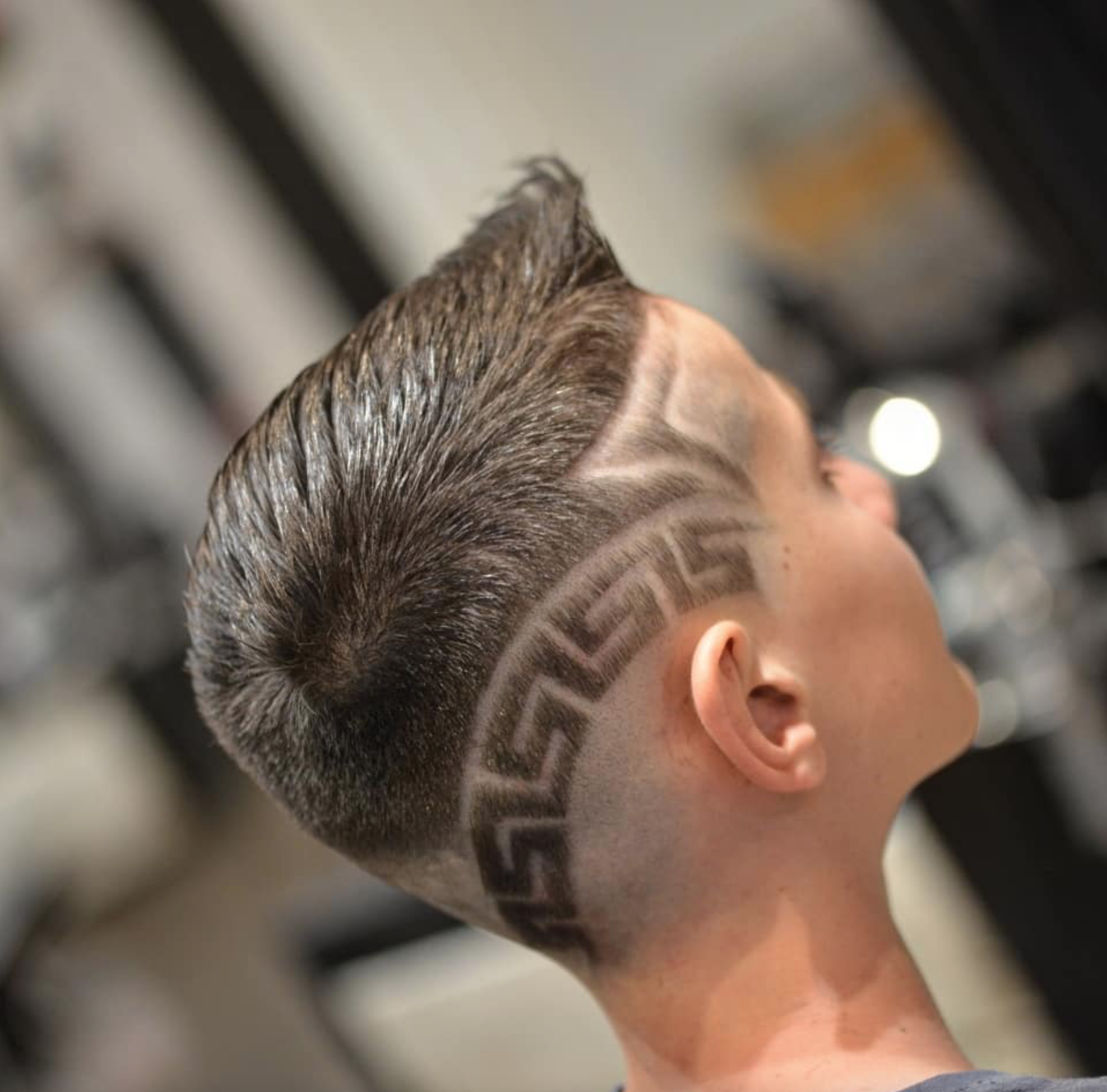 Close-up of a person's hairstyle with shaved sides featuring a Greek key pattern.