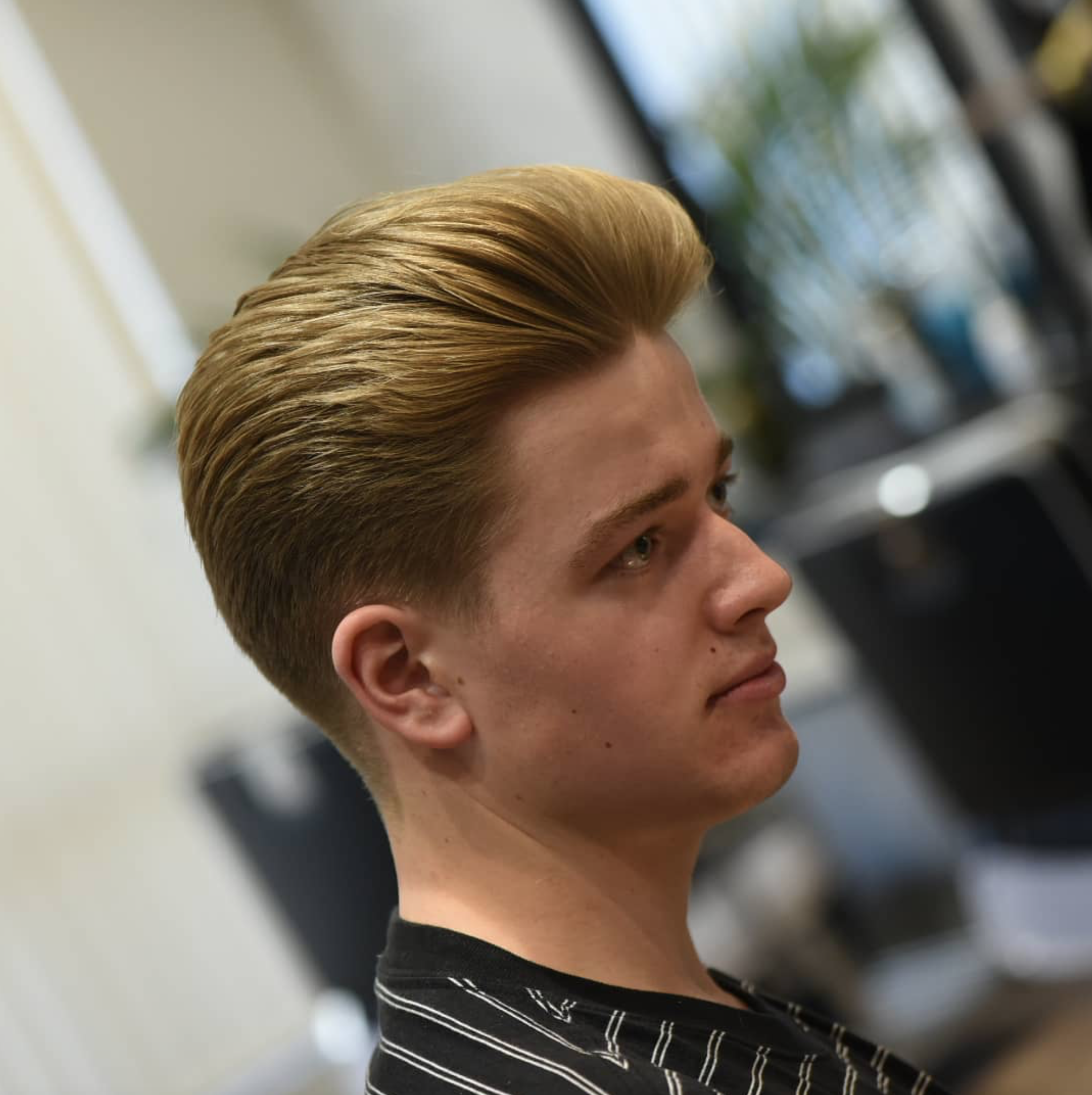 A young man with a classic pompadour hairstyle featuring slicked-back, blonde hair.