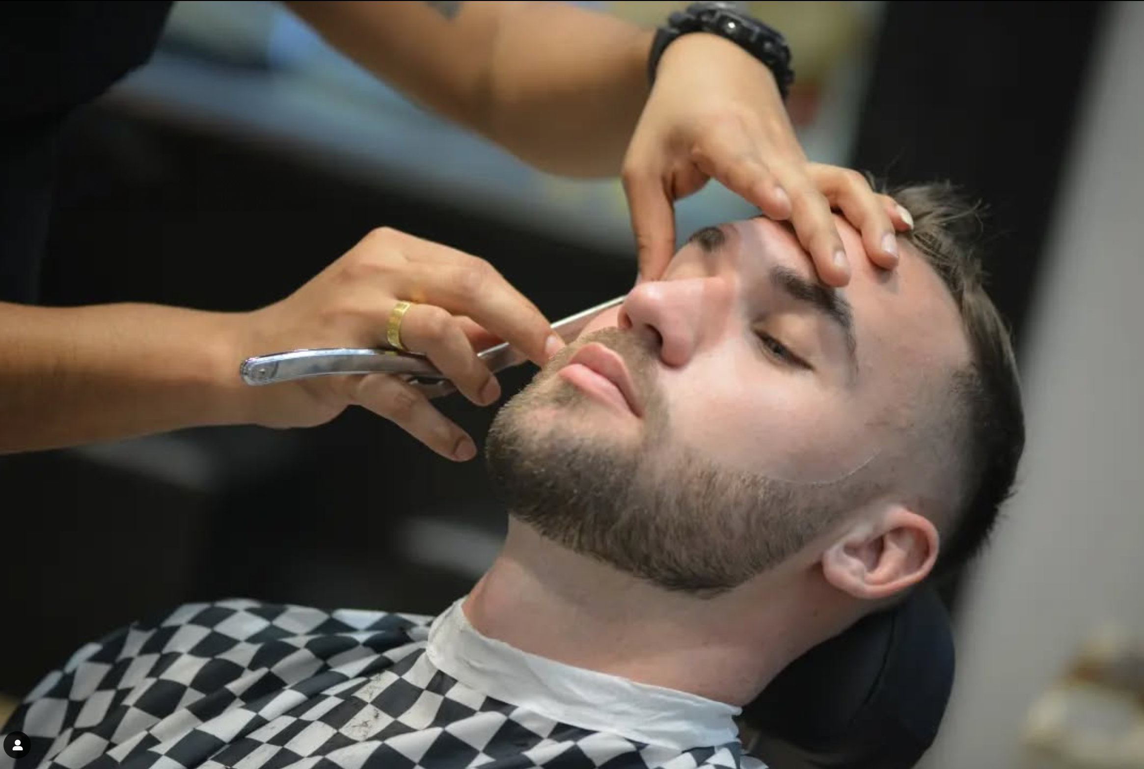 Male customer getting a facial shave at barber shop, with barber using a straight razor and holding client's skin.
